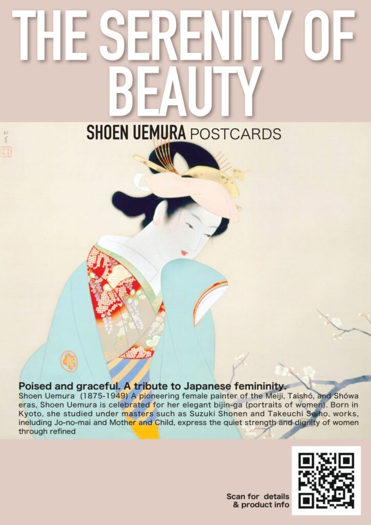 Born in Kyoto City, Shōen Uemura lost her father shortly before her birth and was raised by her mother, Nakako. In 1887, she entered the Kyoto Prefectural Art School and studied under renowned painters Shōnen Suzuki, Bairei Kōno, and Seiho Takeuchi. At the age of 15, her work, The Beauty of Four Seasons, received top honors at the 3rd National Industrial Exhibition and was purchased by a British prince. In 1941, she became a member of the Imperial Art Academy, and in 1948, she became the first woman to receive the Order of Culture. Uemura was celebrated for her refined bijin-ga (portraits of beautiful women), which radiated elegance and grace.